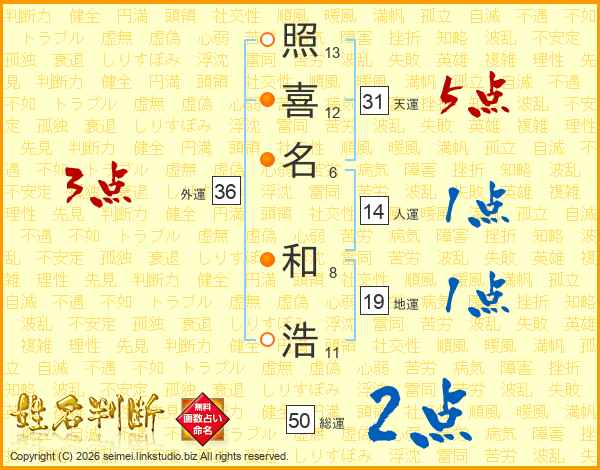 照(13画)喜(12画)名(6画) 和(8画)浩(11画)
