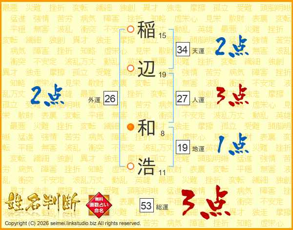 稲(15画)辺(19画) 和(8画)浩(11画)