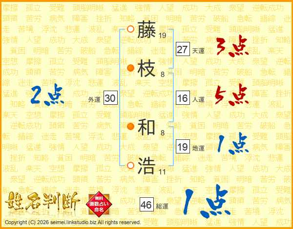 藤(19画)枝(8画) 和(8画)浩(11画)