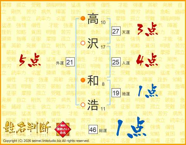 あなたの人生を表す1番重要な運勢です。生涯を通じて影響する総合運となり、主に50歳以降の晩年期に影響を及ぼします。苗字と名前の合計画数。