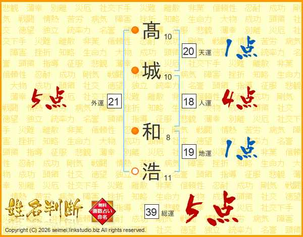 あなたの人生を表す1番重要な運勢です。生涯を通じて影響する総合運となり、主に50歳以降の晩年期に影響を及ぼします。苗字と名前の合計画数。