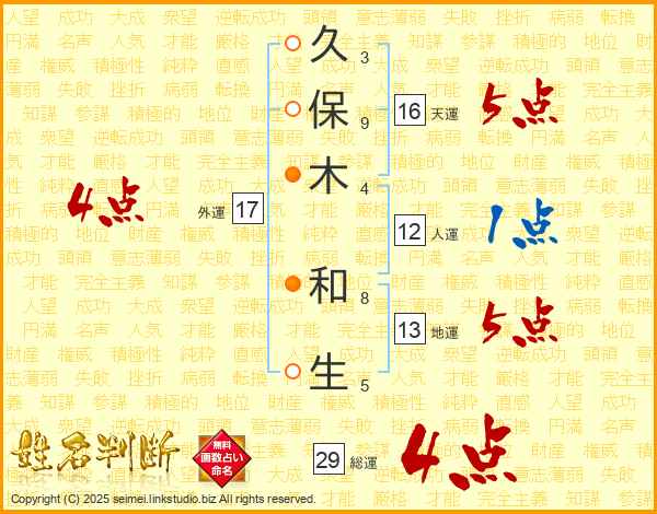 久(3画)保(9画)木(4画) 和(8画)生(5画)