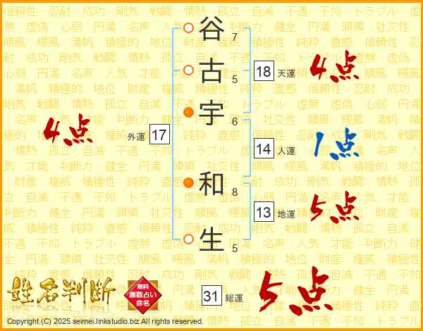 谷(7画)古(5画)宇(6画) 和(8画)生(5画)