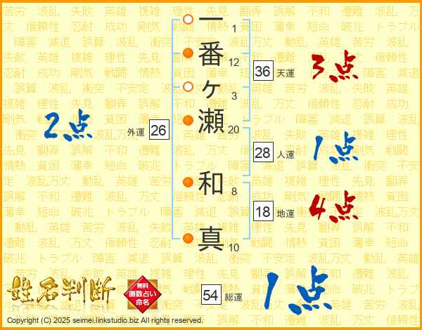 一(1画)番(12画)ヶ(3画)瀬(20画) 和(8画)真(10画)