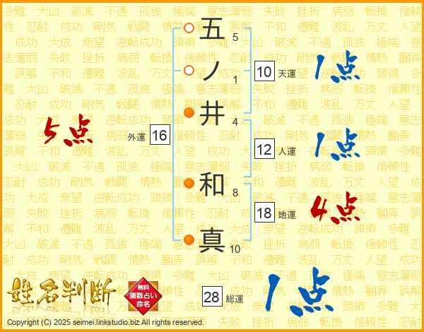 生活面を象徴する運勢です。外部から受ける影響力を表し、結婚運、家庭運や職場、環境への順応性を表します。総運から人運を引いた画数。姓や名が1文字の場合を除く。
