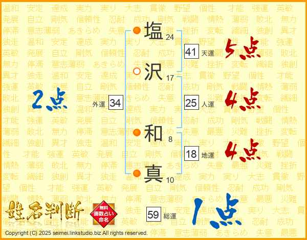 塩(24画)沢(17画) 和(8画)真(10画)