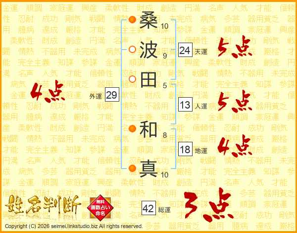桑(10画)波(9画)田(5画) 和(8画)真(10画)