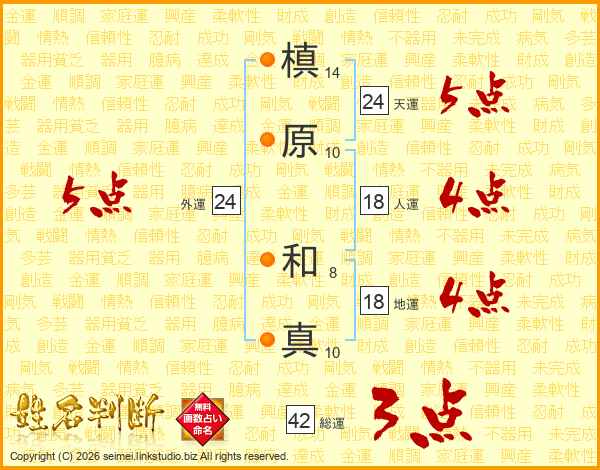 生活面を象徴する運勢です。外部から受ける影響力を表し、結婚運、家庭運や職場、環境への順応性を表します。総運から人運を引いた画数。姓や名が1文字の場合を除く。