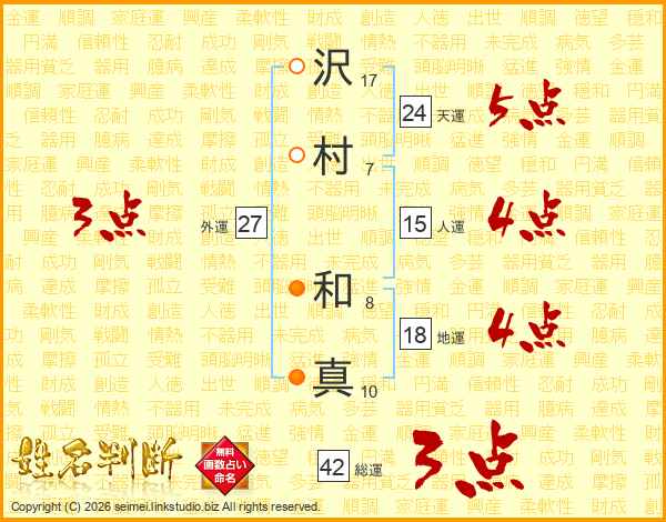 沢(17画)村(7画) 和(8画)真(10画)