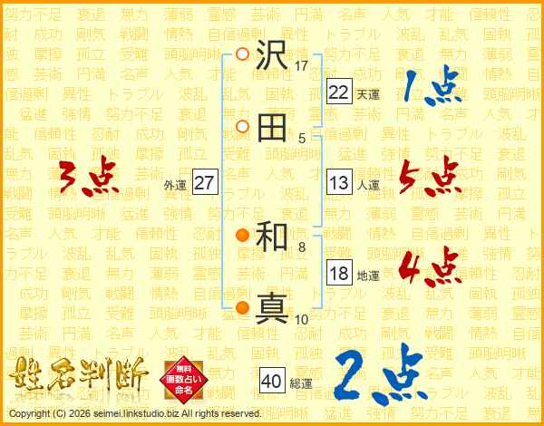 生活面を象徴する運勢です。外部から受ける影響力を表し、結婚運、家庭運や職場、環境への順応性を表します。総運から人運を引いた画数。姓や名が1文字の場合を除く。