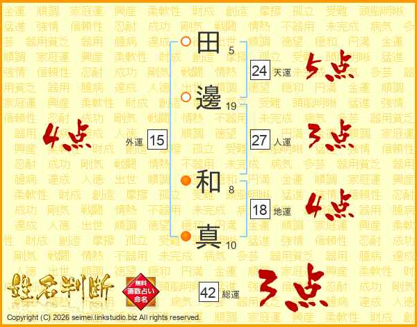 田(5画)邊(19画) 和(8画)真(10画)