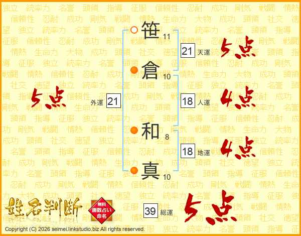 あなたの人生を表す1番重要な運勢です。生涯を通じて影響する総合運となり、主に50歳以降の晩年期に影響を及ぼします。苗字と名前の合計画数。