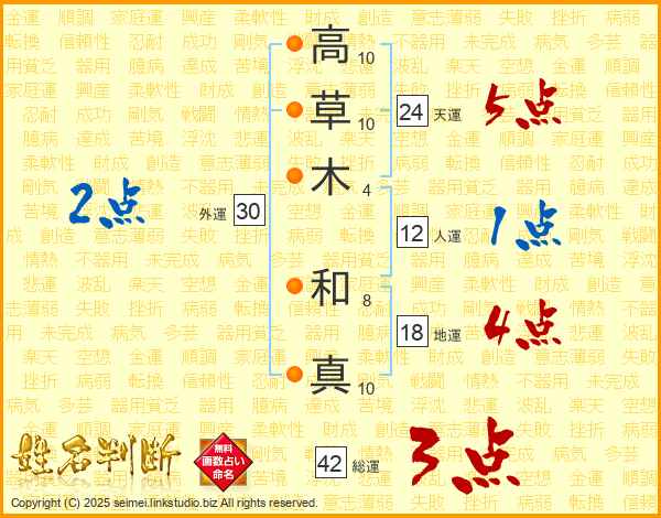 高(10画)草(10画)木(4画) 和(8画)真(10画)