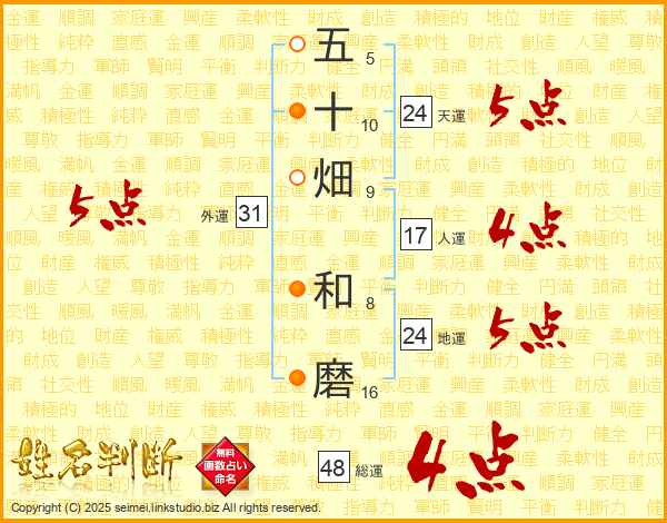 生活面を象徴する運勢です。外部から受ける影響力を表し、結婚運、家庭運や職場、環境への順応性を表します。総運から人運を引いた画数。姓や名が1文字の場合を除く。