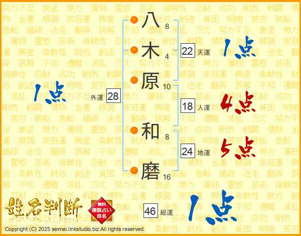 八(8画)木(4画)原(10画) 和(8画)磨(16画)