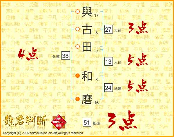 與(17画)古(5画)田(5画) 和(8画)磨(16画)
