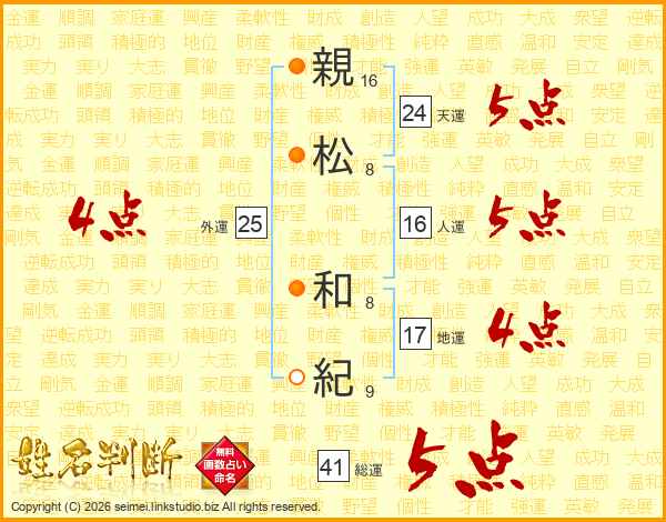 あなたの人生を表す1番重要な運勢です。生涯を通じて影響する総合運となり、主に50歳以降の晩年期に影響を及ぼします。苗字と名前の合計画数。