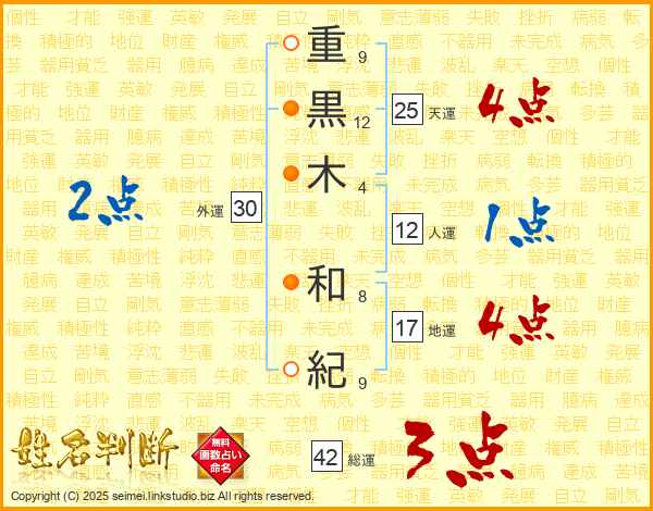 重(9画)黒(12画)木(4画) 和(8画)紀(9画)