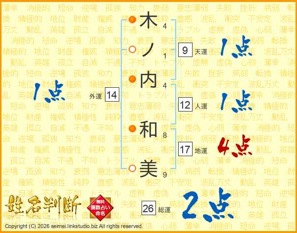 木(4画)ノ(1画)内(4画) 和(8画)美(9画)