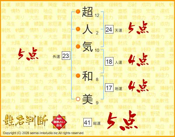 超(12画)人(2画)気(10画) 和(8画)美(9画)