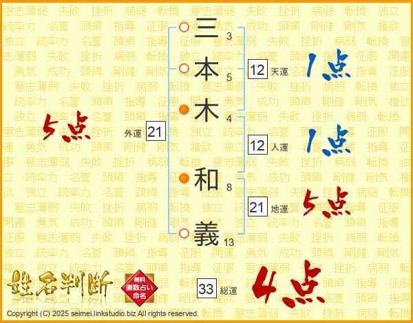 三(3画)本(5画)木(4画) 和(8画)義(13画)