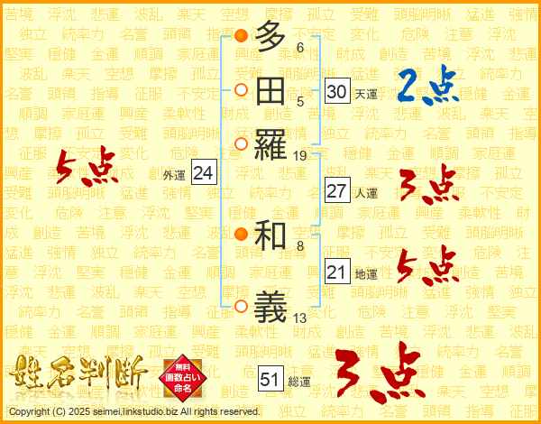 多(6画)田(5画)羅(19画) 和(8画)義(13画)