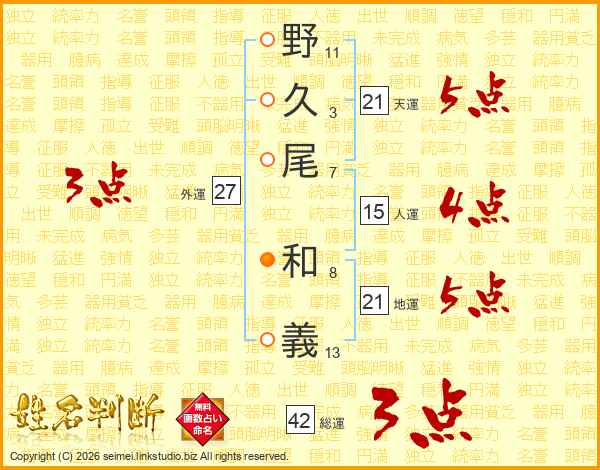 野(11画)久(3画)尾(7画) 和(8画)義(13画)