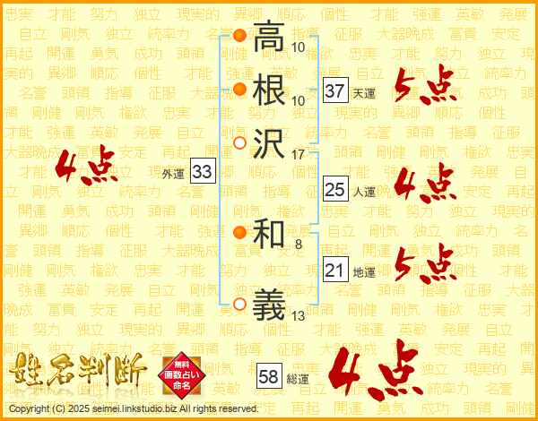 高(10画)根(10画)沢(17画) 和(8画)義(13画)
