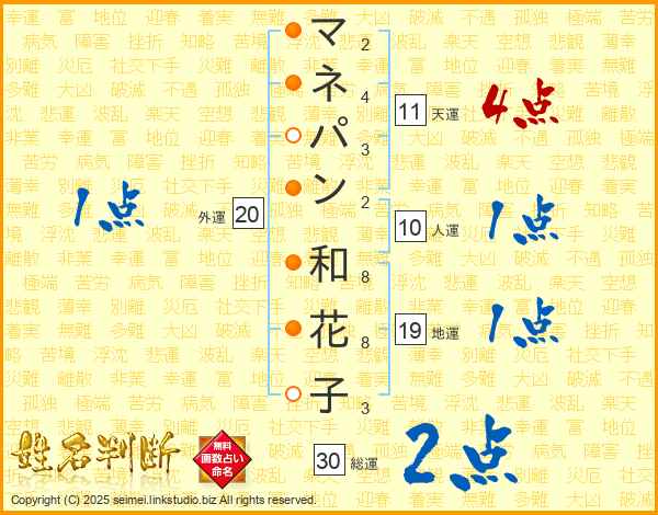 生活面を象徴する運勢です。外部から受ける影響力を表し、結婚運、家庭運や職場、環境への順応性を表します。総運から人運を引いた画数。姓や名が1文字の場合を除く。