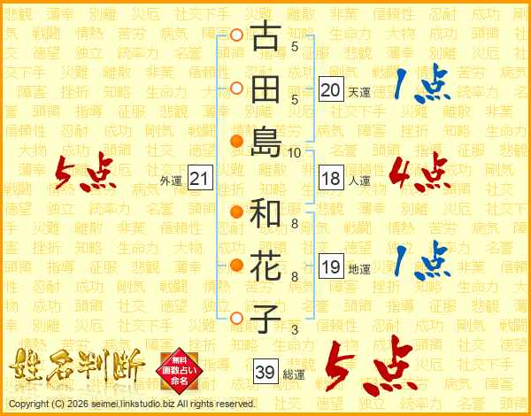 古(5画)田(5画)島(10画) 和(8画)花(8画)子(3画)