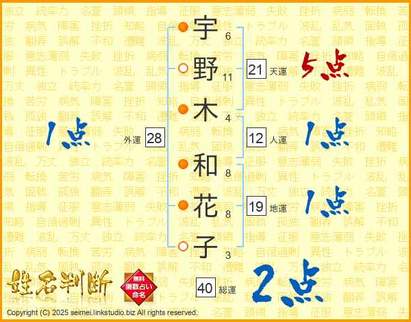 宇(6画)野(11画)木(4画) 和(8画)花(8画)子(3画)