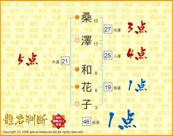 桑(10画)澤(17画) 和(8画)花(8画)子(3画)