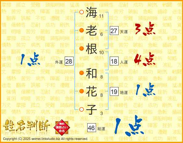 海(11画)老(6画)根(10画) 和(8画)花(8画)子(3画)