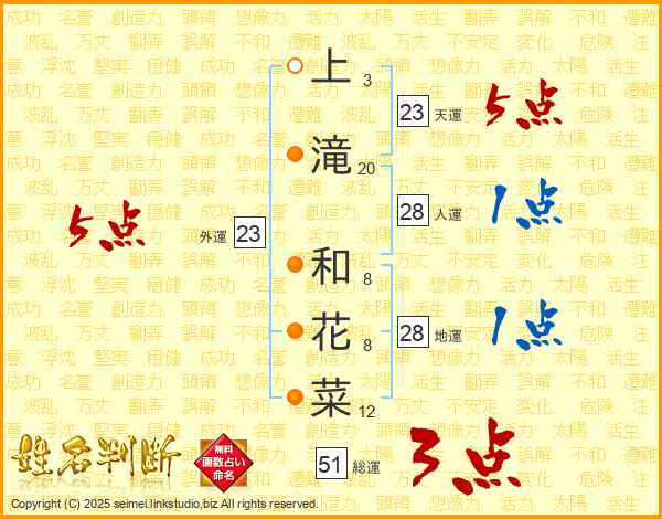 上(3画)滝(20画) 和(8画)花(8画)菜(12画)