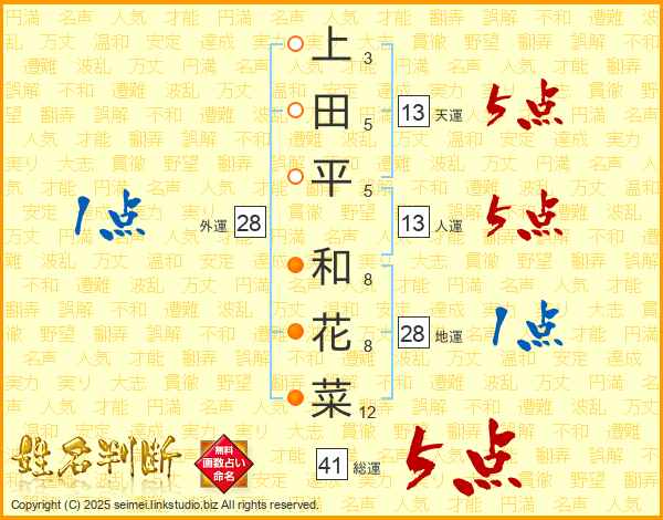 上(3画)田(5画)平(5画) 和(8画)花(8画)菜(12画)