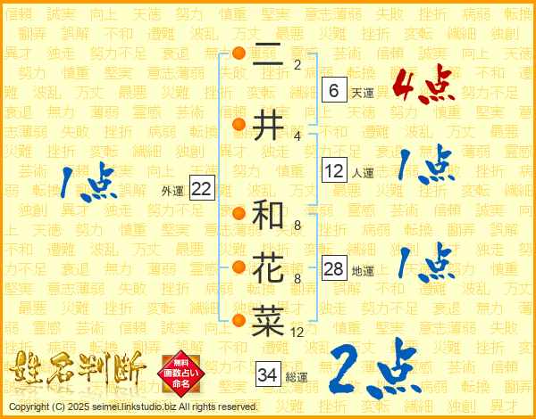二(2画)井(4画) 和(8画)花(8画)菜(12画)