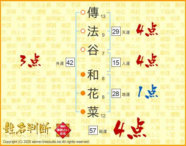 生活面を象徴する運勢です。外部から受ける影響力を表し、結婚運、家庭運や職場、環境への順応性を表します。総運から人運を引いた画数。姓や名が1文字の場合を除く。
