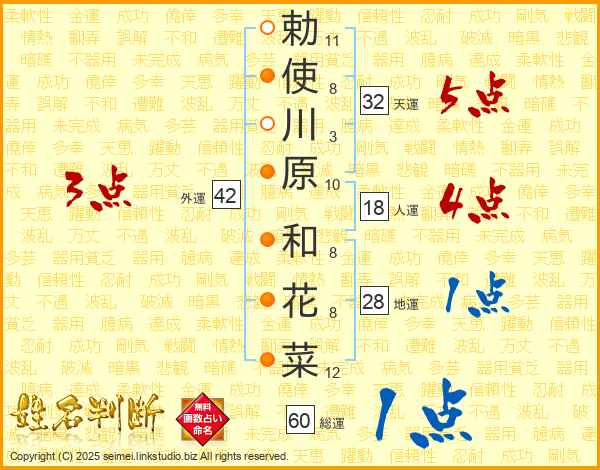 勅(11画)使(8画)川(3画)原(10画) 和(8画)花(8画)菜(12画)