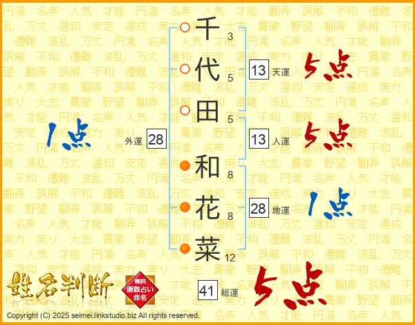 千(3画)代(5画)田(5画) 和(8画)花(8画)菜(12画)