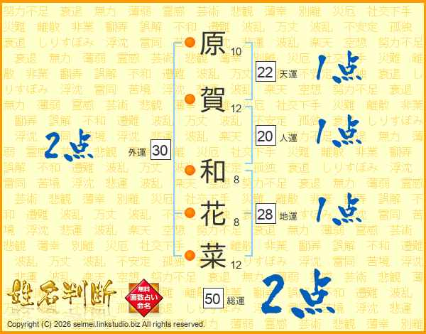 原(10画)賀(12画) 和(8画)花(8画)菜(12画)