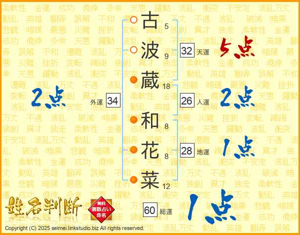古(5画)波(9画)蔵(18画) 和(8画)花(8画)菜(12画)
