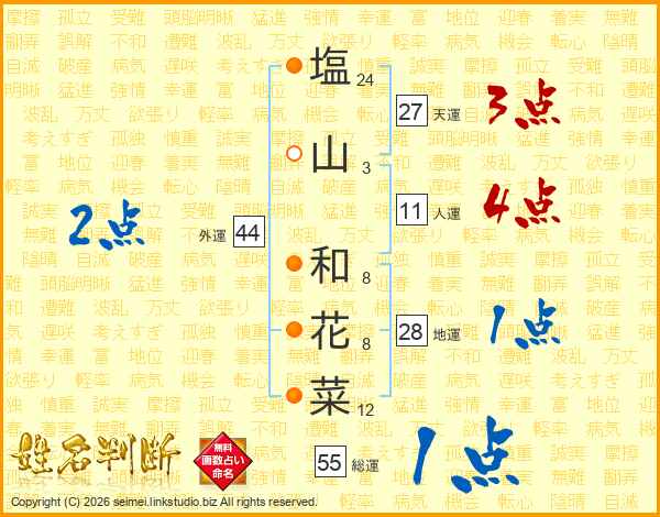 塩(24画)山(3画) 和(8画)花(8画)菜(12画)