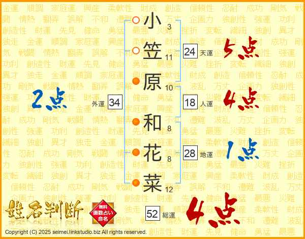 小(3画)笠(11画)原(10画) 和(8画)花(8画)菜(12画)