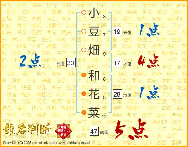 生活面を象徴する運勢です。外部から受ける影響力を表し、結婚運、家庭運や職場、環境への順応性を表します。総運から人運を引いた画数。姓や名が1文字の場合を除く。
