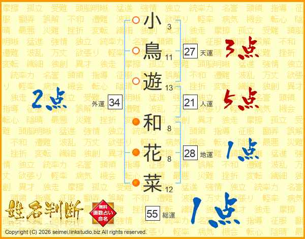 小(3画)鳥(11画)遊(13画) 和(8画)花(8画)菜(12画)