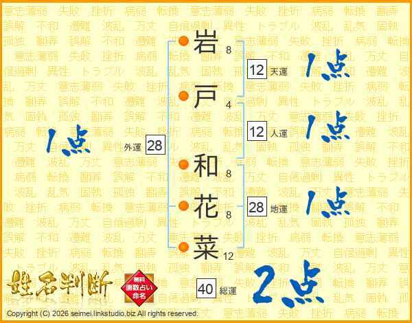 岩(8画)戸(4画) 和(8画)花(8画)菜(12画)
