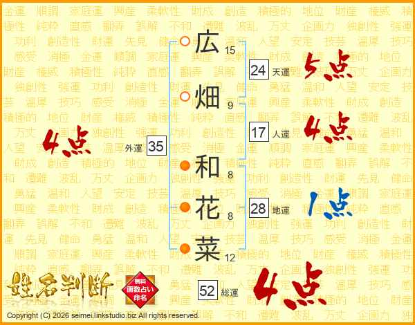 広(15画)畑(9画) 和(8画)花(8画)菜(12画)