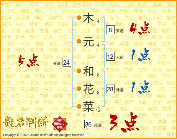 木(4画)元(4画) 和(8画)花(8画)菜(12画)