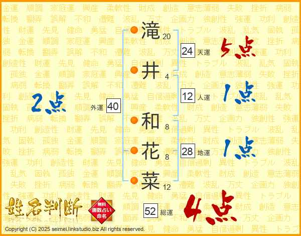 滝(20画)井(4画) 和(8画)花(8画)菜(12画)