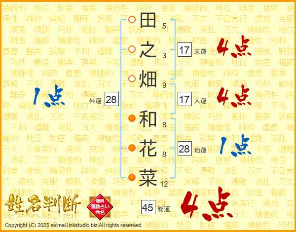 田(5画)之(3画)畑(9画) 和(8画)花(8画)菜(12画)